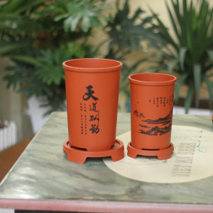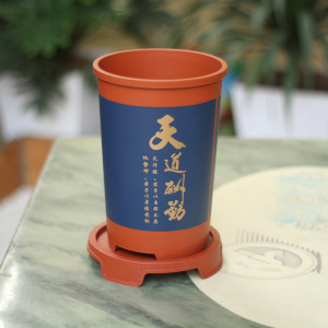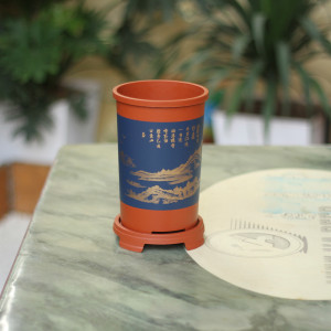 – Đặc điểm: Chậu có dáng hình trụ, đáy chậu có lỗ thoát nước, chậu có kèm đĩa tiền dụng,thân chậu in các hình nổi rõ nét, đặc sắc như Tùng, Trúc, Cúc , Mai, chữ Hán ngữ.,
