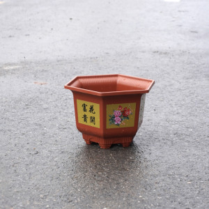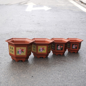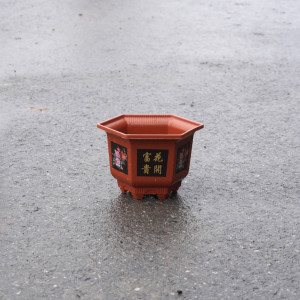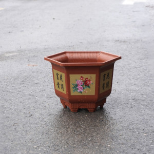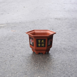 – Đặc điểm: Chậu hình lục giác dáng thấp, đáy chậu có lỗ thoát nước, thân chậu in các hình nổi rõ nét, đặc sắc như Tùng, Trúc, Cúc , Mai, chữ Hán ngữ.,
