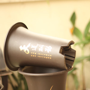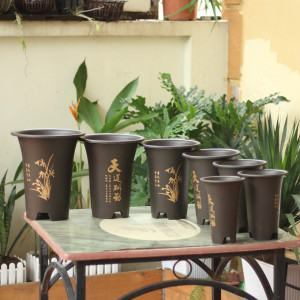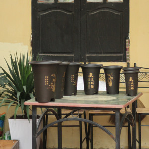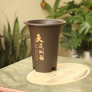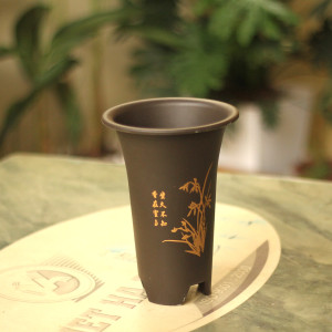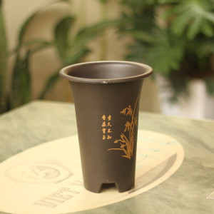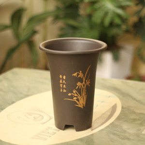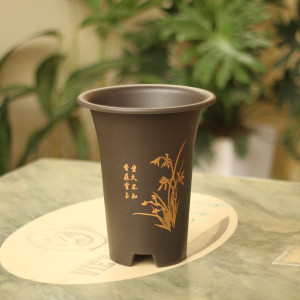 – Đặc điểm: Chậu hình giống lọ hoa dáng cao, đáy chậu có lỗ thoát nước, thân chậu in các hình nổi rõ nét, đặc sắc như Tùng, Trúc, Cúc , Mai, chữ Hán ngữ.,