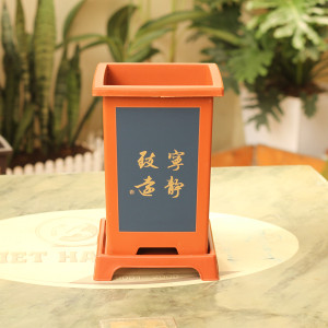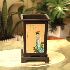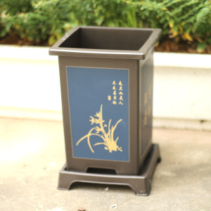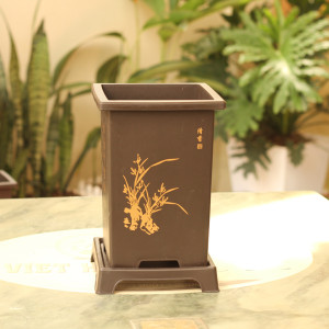 – Đặc điểm: Chậu có hình chữ nhật, đáy chậu có lỗ thoát nước, thân chậu in các hình nổi rõ nét, đặc sắc như Tùng, Trúc, Cúc , Mai, chữ Hán ngữ., chậu kèm đĩa siêu xinh………