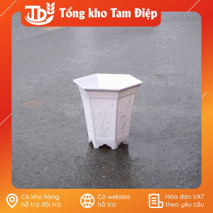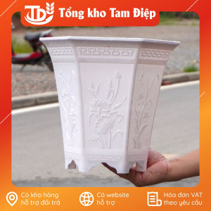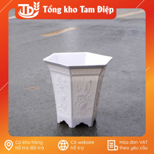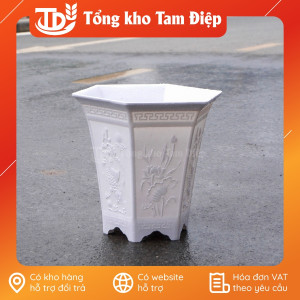 – Đặc điểm: Chậu hình lục giác dáng cao, đáy chậu có lỗ thoát nước, màu sắc giả sứ sáng đẹp, dễ vệ sinh, bề mặt chậu in hình nổi đặc sắc, chậu có đế chân cao tiện dụng