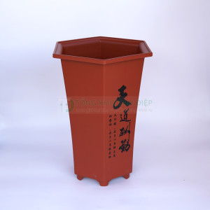 Chậu có 2 màu đỏ gạch/đen cùng với thiết kế miệng lục giác dáng cao nên phù hợp với mọi không gian nhỏ, vừa và rộng. Trên thân chậu được in các họa tiết chữ Hán nghệ thuật vô cùng sắc nét. Đặc biệt, dưới đế chậu có chân và lỗ thoát nước giúp cây không bị úng nước, miệng chậu có vành giúp bạn dễ dàng di chuyển vị trí của chậu.