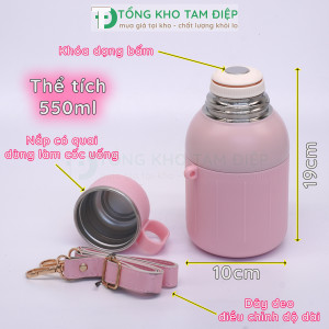 - Bình có thiết kế 3 phần. nắp bình được đóng kín 2 lớp không bị rò rỉ nước khi úp ngược. Có nắp đậy dạng cốc để bạn có thể rót nước ra và uống, thân binh có dây đeo chéo vô cùng tiện lợi.